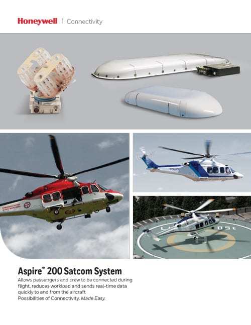 Honeywell has secured FAA and EASA supplemental type certification (STC) for the Aspire 200 for the AgustaWestland’s AW139 platform. This is the first rotorcraft certification utilizing this newly developed Inmarsat high-data rate (HDR) service.