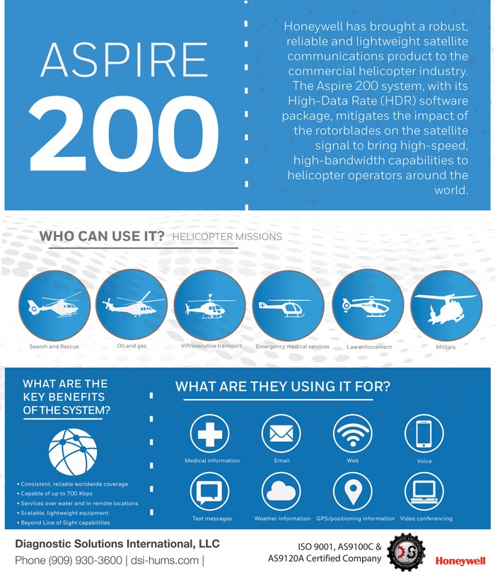 Honeywell’s performance is unmatched and unparalleled. The Aspire 200 System with HDR can transmit more data, faster than any other L-band system. No matter your mission — EMS, Law Enforcement, Oil and Gas, Search and Rescue, VIP – or the area of operations, the Aspire 200 System provides a high-speed data connection that is always on.