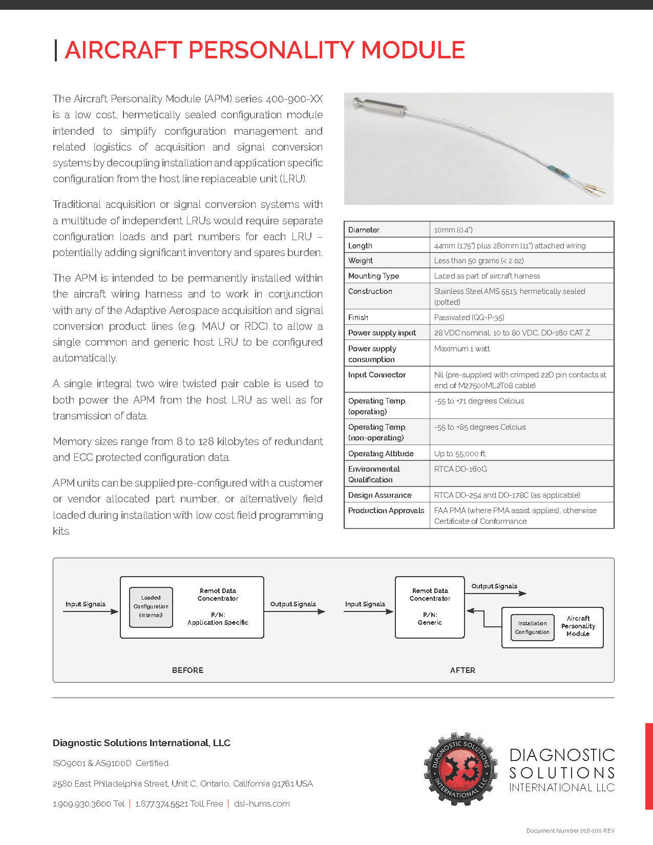 The Aircraft Personality Module (APM) series 400-900-XX is a low cost, hermetically sealed configuration module intended to simplify configuration management and related logistics of acquisition and signal conversion systems by decoupling installation and application specific configuration from the host line replaceable unit (LRU).