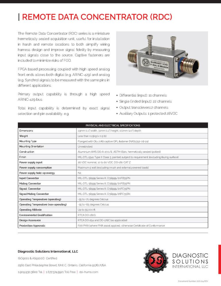 The Remote Data Concentrator (RDC) series is a miniature hermetically sealed acquisition unit, useful for installation in harsh and remote locations to both simplify wiring harness design and improve signal fidelity by measuring input signals close to the source. Captive fasteners are included to minimize risks of FOD.